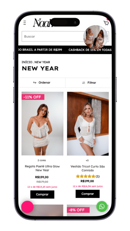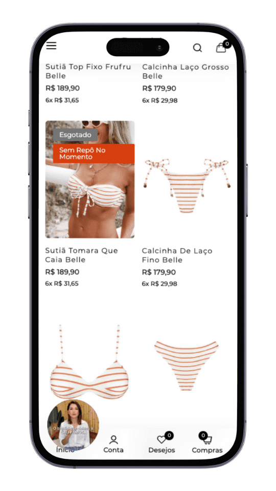 O vídeo é mostrado ao visitante do seu site em uma miniatura flutuante sobre a página com uma chamada em destaque, ao clicar, é aberto para visualização com elementos de interação como link de produto relacionado, botão de curtir, comentário ou chamada no whatsapp.